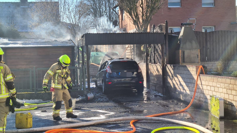 Die ersteintreffende Hauptamtliche Wache fand einen in Vollbrand stehenden Carport mit einem darunter stehenden PKW vor. Das Feuer hatte bereits auf ein angrenzendes Gartenhaus übergegriffen. Umgehend wurden zwei Trupps unter Atemschutz mit jeweils einem C-Rohr zur Brandbekämpfung eingesetzt. Im Einsatzverlauf wurde die Brandbekämpfung um ein weiteres C-Rohr sowie ein Schaumrohr ergänzt. Nach rund 20 Minuten war das Feuer unter Kontrolle.