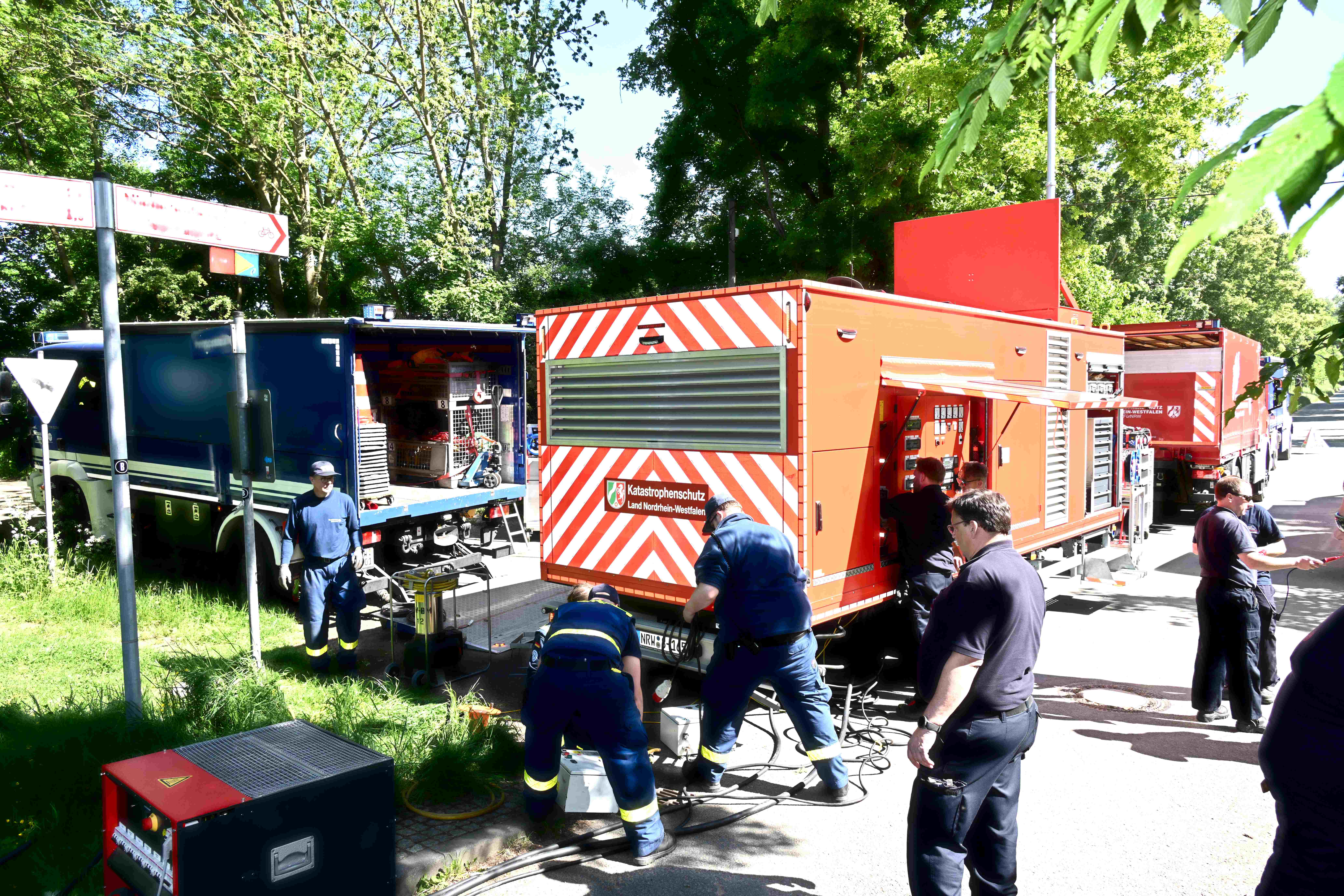Das Technische Hilfswerk (THW) mit seinem Ortsverband Bergheim und die Feuerwehr Pulheim haben am Samstagvormittag (10.05.2025) eine gemeinsame Übung an der Erft in Bergheim durchgeführt. Die Fachgruppe „Wasserschaden / Pumpen“ des THW und die Notstromkomponente des Katastrophenschutzes des Landes Nordrhein-Westfalen, welche bei der Feuerwehr in Pulheim stationiert ist und von dieser betrieben wird, testeten ihre Zusammenarbeit für den Fall eines größeren Einsatzes, bei dem auch elektrisch betriebene Pumpen benötigt werden.