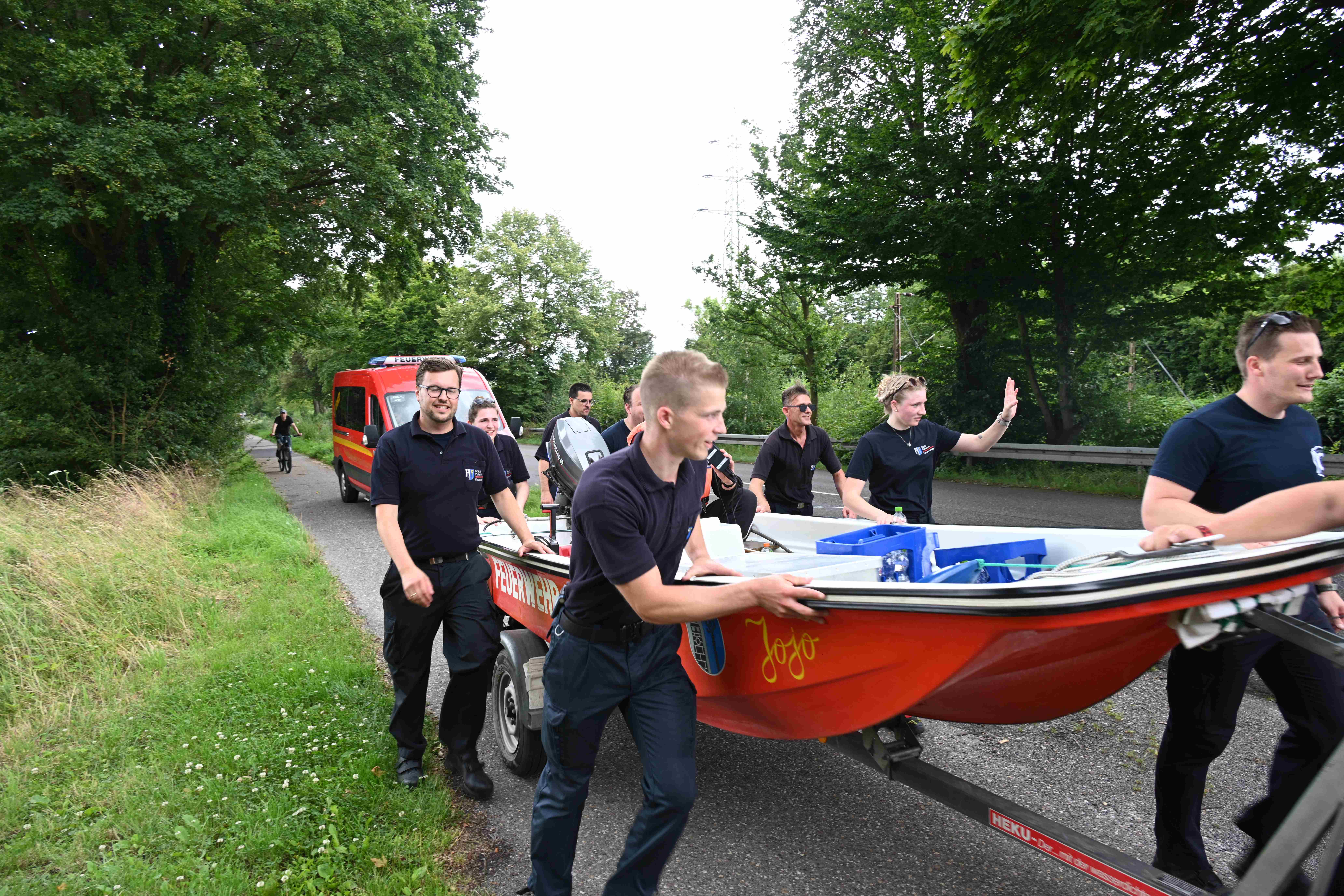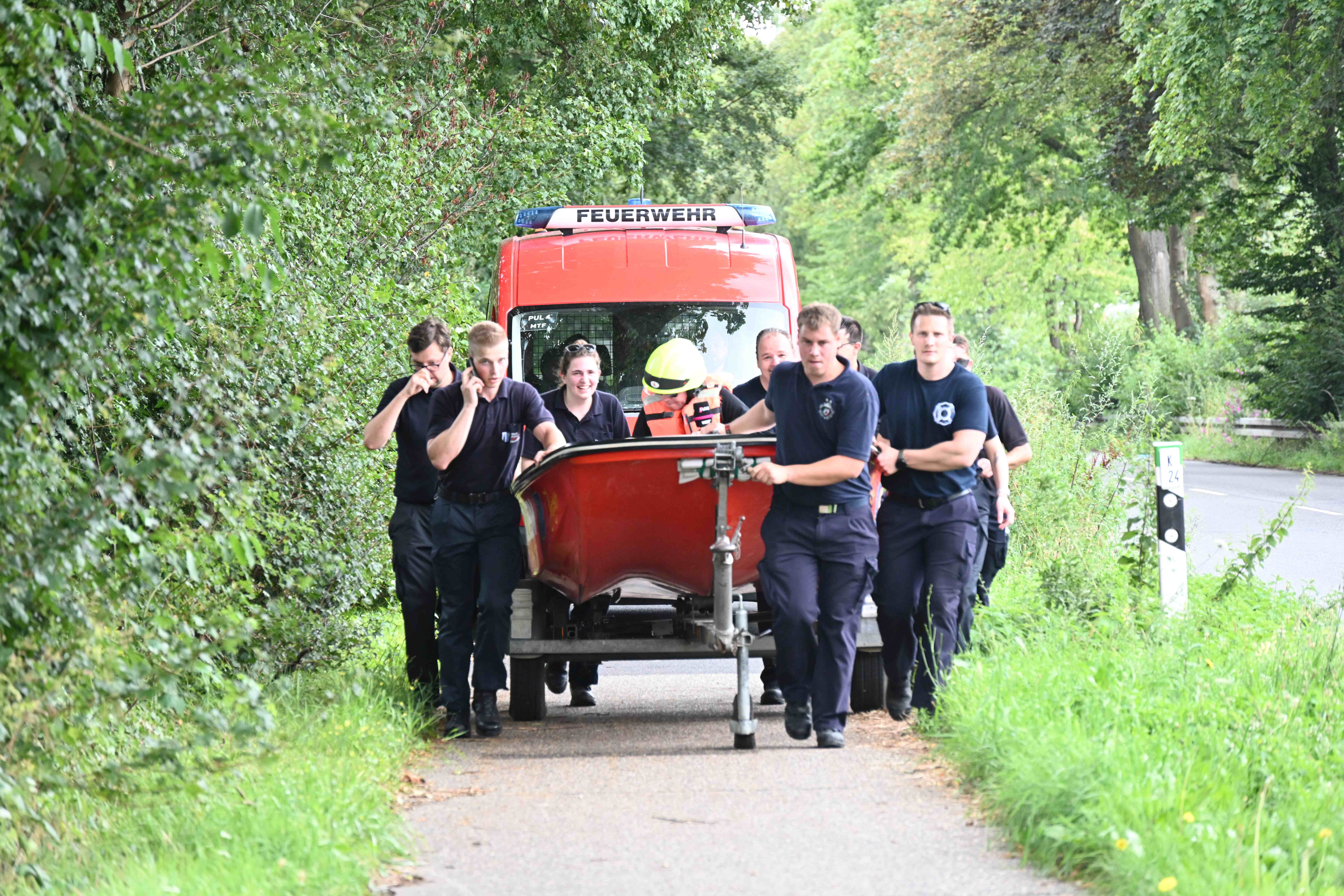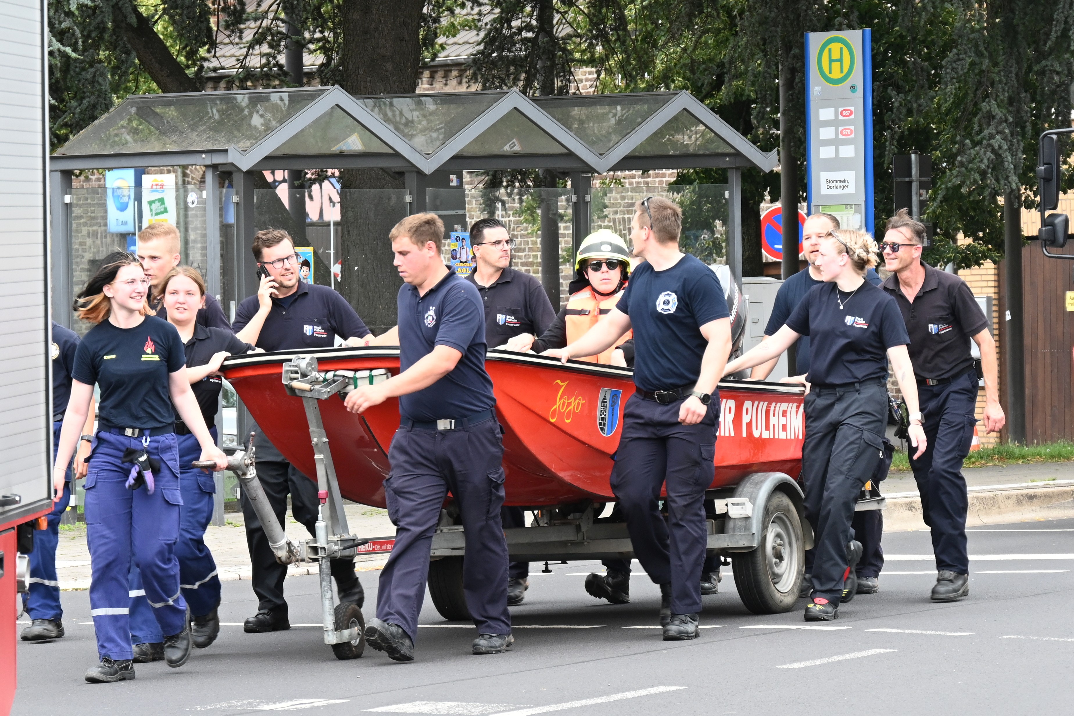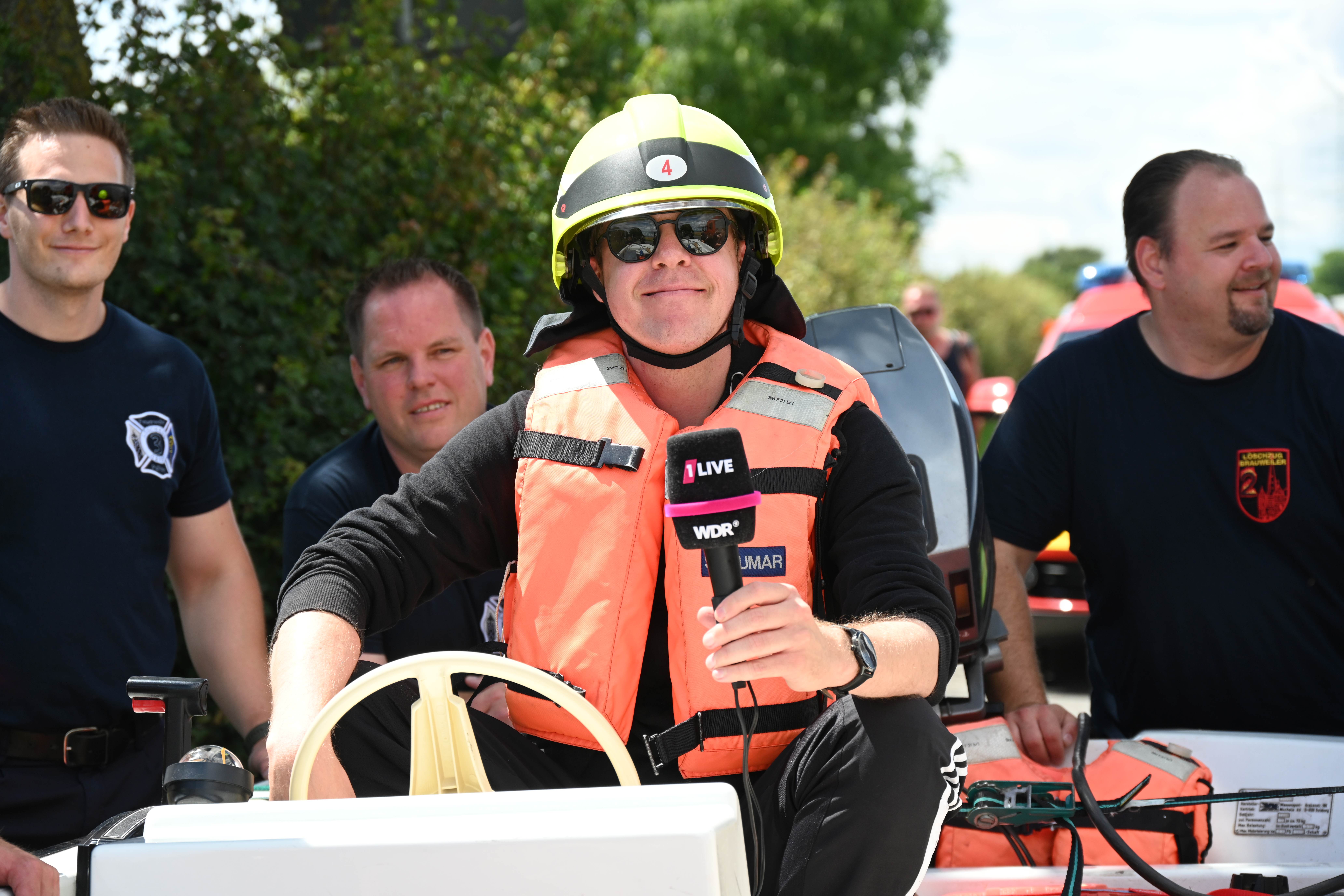 Ursprünglich wurde Daniel Danger am Dienstagvormittag, 16.07., in Pulheim, am Paul-Decker-Platz von 20 Mitgliedern der Feuerwehr erwartet. Von hier aus sollte die etwa knapp fünf Kilometer lange Tour mit einem auf einem Bootstrailer aufliegenden Mehrzweckboot bis hinter den Ortsausgang Stommeln gehen. Auf seinem Weg nach Pulheim kam es aber zu Verzögerungen, so dass sich das Team der Feuerwehr entschloss, Daniel Danger bereits ab der Stadtgrenze zwischen Köln und Brauweiler auf seiner Reise nach Weeze zu unterstützen. Nachdem Danger, ohne den Boden zu berühren, das Boot der Feuerwehr geentert hatte, ihm eine Schwimmweste und ein Feuerwehrhelm angelegt worden ist und er am Steuerrad Platz genommen hatte, begann die Fahrt entlang des Randkanals Richtung Pulheim. Auf dem Weg hatte Daniel Danger stets Kontakt zu seinem Sender und moderierte aus dem Boot heraus mehrere Liveschaltungen. Schnell wurde durch die Feuerwehr noch eine Route entworfen, um den Pulheimer Ortskern möglichst nur über kleine Nebenstraßen zu passieren, um dann auf dem Fahrradweg der Venloer Strasse Richtung Stommeln zu gelangen. Am Marktplatz in Stommeln wurde die Etappe nach knapp 10 Kilometern und der beachtlichen Zeit von 95 Minuten beendet. Nach dieser Leistung bedankte sich Goos und Danger bei allen Kräften für die flotte Fahrt und man war froh, den Moderator wohlbehalten und ohne gekentert zu sein, dem nächsten 1Live Zuhörerteam übergeben zu können, die den Weg dann mit einem Bollerwagen Richtung Rommerskirchen fortsetzten.