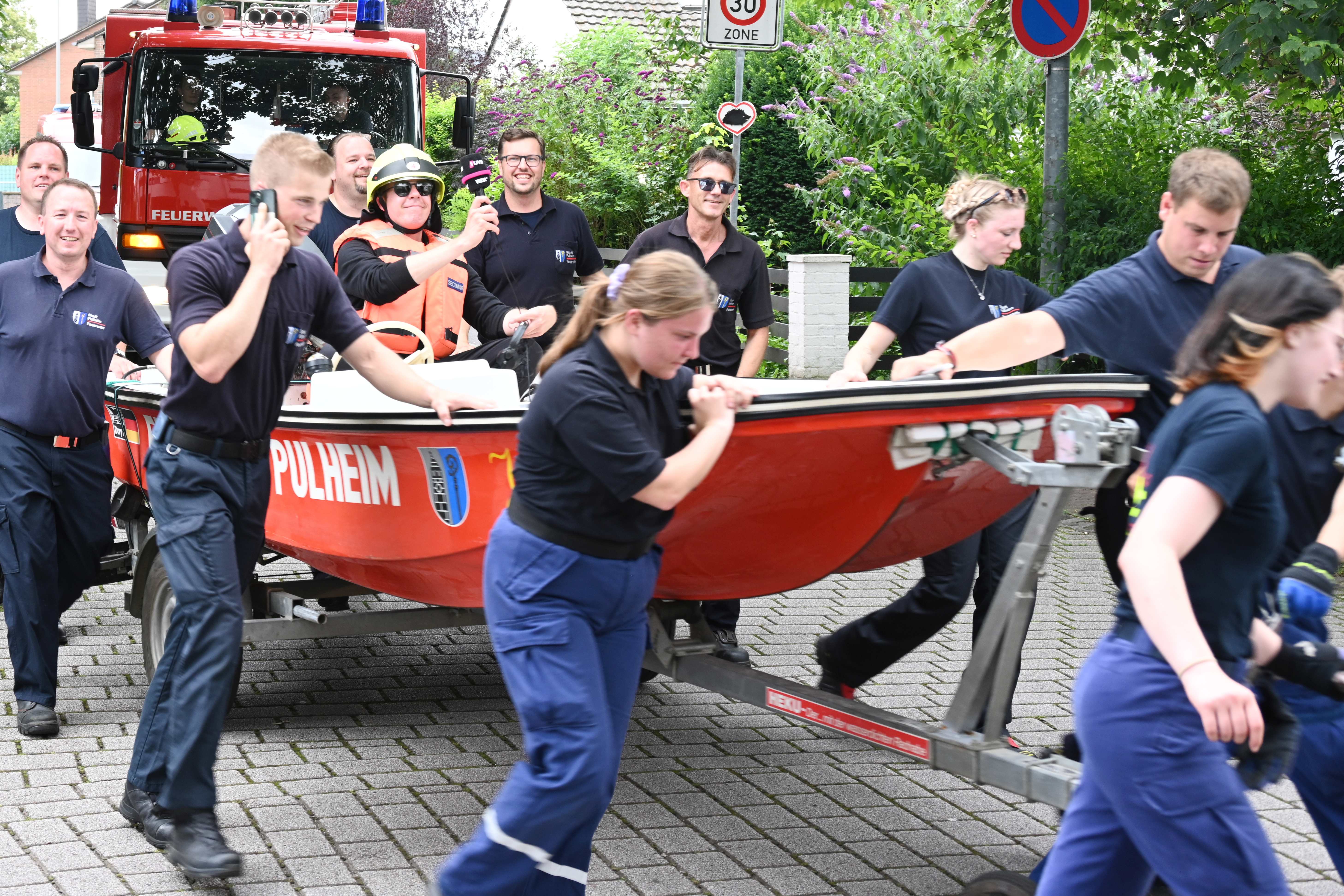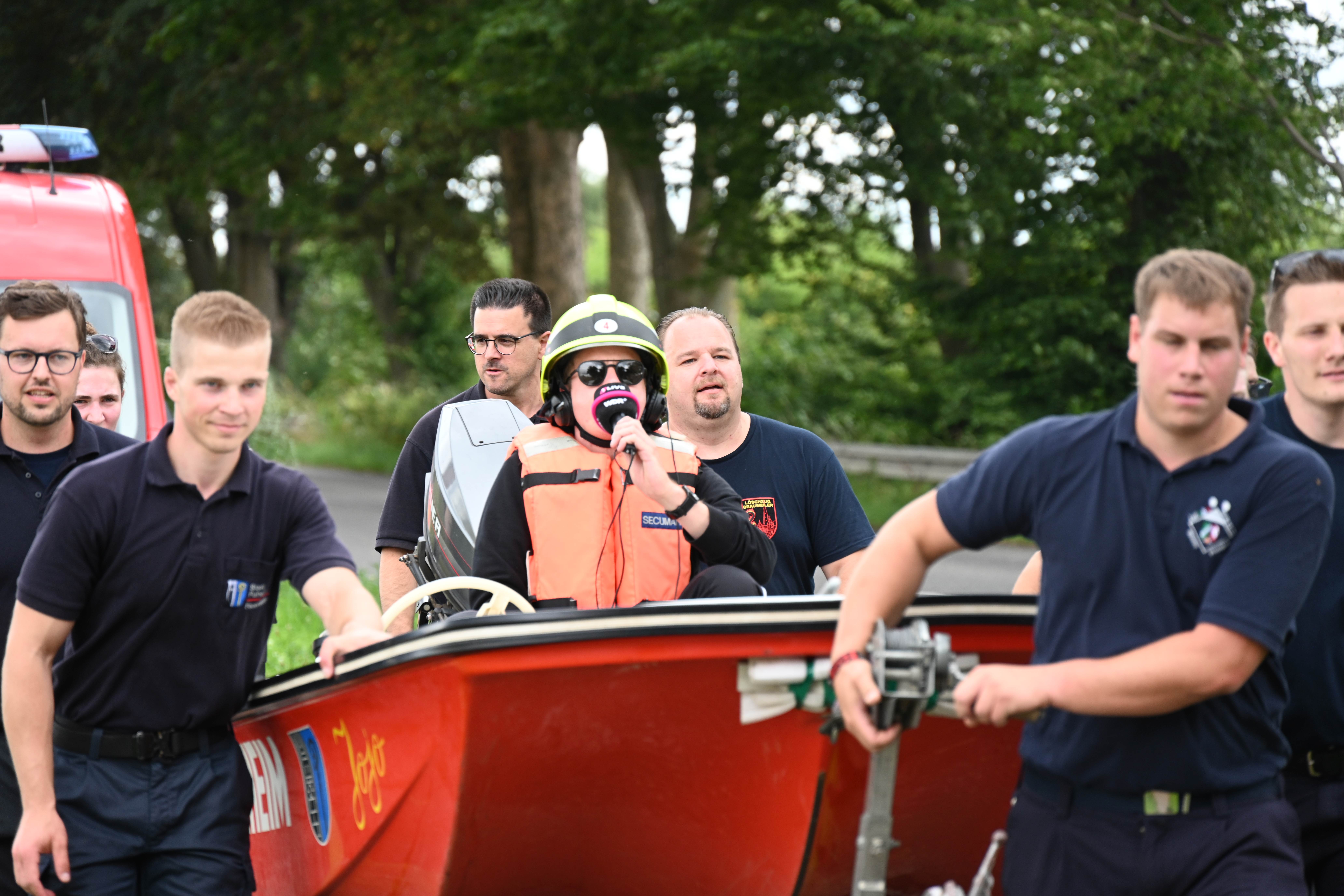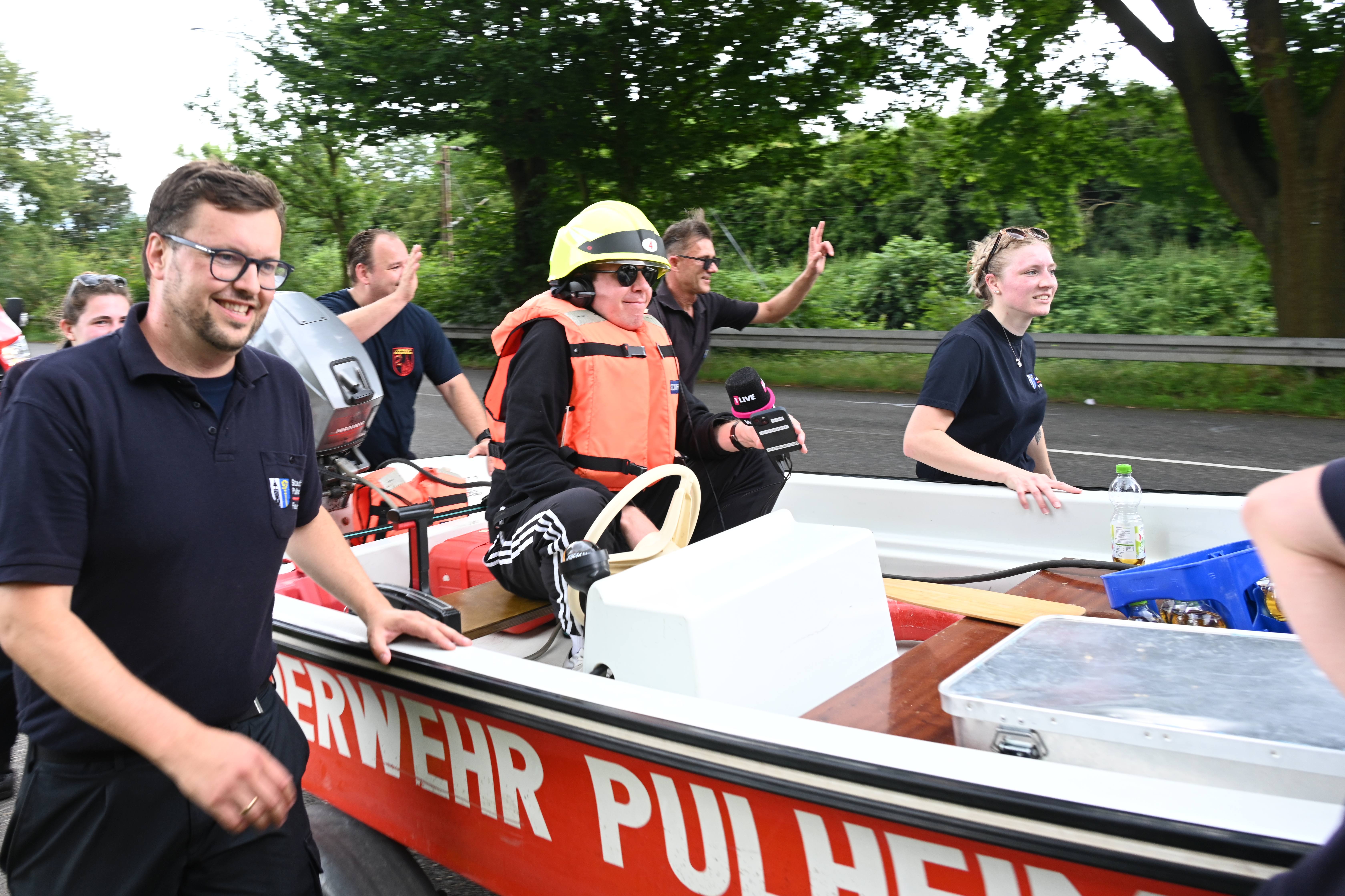 Ursprünglich wurde Daniel Danger am Dienstagvormittag, 16.07., in Pulheim, am Paul-Decker-Platz von 20 Mitgliedern der Feuerwehr erwartet. Von hier aus sollte die etwa knapp fünf Kilometer lange Tour mit einem auf einem Bootstrailer aufliegenden Mehrzweckboot bis hinter den Ortsausgang Stommeln gehen. Auf seinem Weg nach Pulheim kam es aber zu Verzögerungen, so dass sich das Team der Feuerwehr entschloss, Daniel Danger bereits ab der Stadtgrenze zwischen Köln und Brauweiler auf seiner Reise nach Weeze zu unterstützen. Nachdem Danger, ohne den Boden zu berühren, das Boot der Feuerwehr geentert hatte, ihm eine Schwimmweste und ein Feuerwehrhelm angelegt worden ist und er am Steuerrad Platz genommen hatte, begann die Fahrt entlang des Randkanals Richtung Pulheim. Auf dem Weg hatte Daniel Danger stets Kontakt zu seinem Sender und moderierte aus dem Boot heraus mehrere Liveschaltungen. Schnell wurde durch die Feuerwehr noch eine Route entworfen, um den Pulheimer Ortskern möglichst nur über kleine Nebenstraßen zu passieren, um dann auf dem Fahrradweg der Venloer Strasse Richtung Stommeln zu gelangen. Am Marktplatz in Stommeln wurde die Etappe nach knapp 10 Kilometern und der beachtlichen Zeit von 95 Minuten beendet. Nach dieser Leistung bedankte sich Goos und Danger bei allen Kräften für die flotte Fahrt und man war froh, den Moderator wohlbehalten und ohne gekentert zu sein, dem nächsten 1Live Zuhörerteam übergeben zu können, die den Weg dann mit einem Bollerwagen Richtung Rommerskirchen fortsetzten.