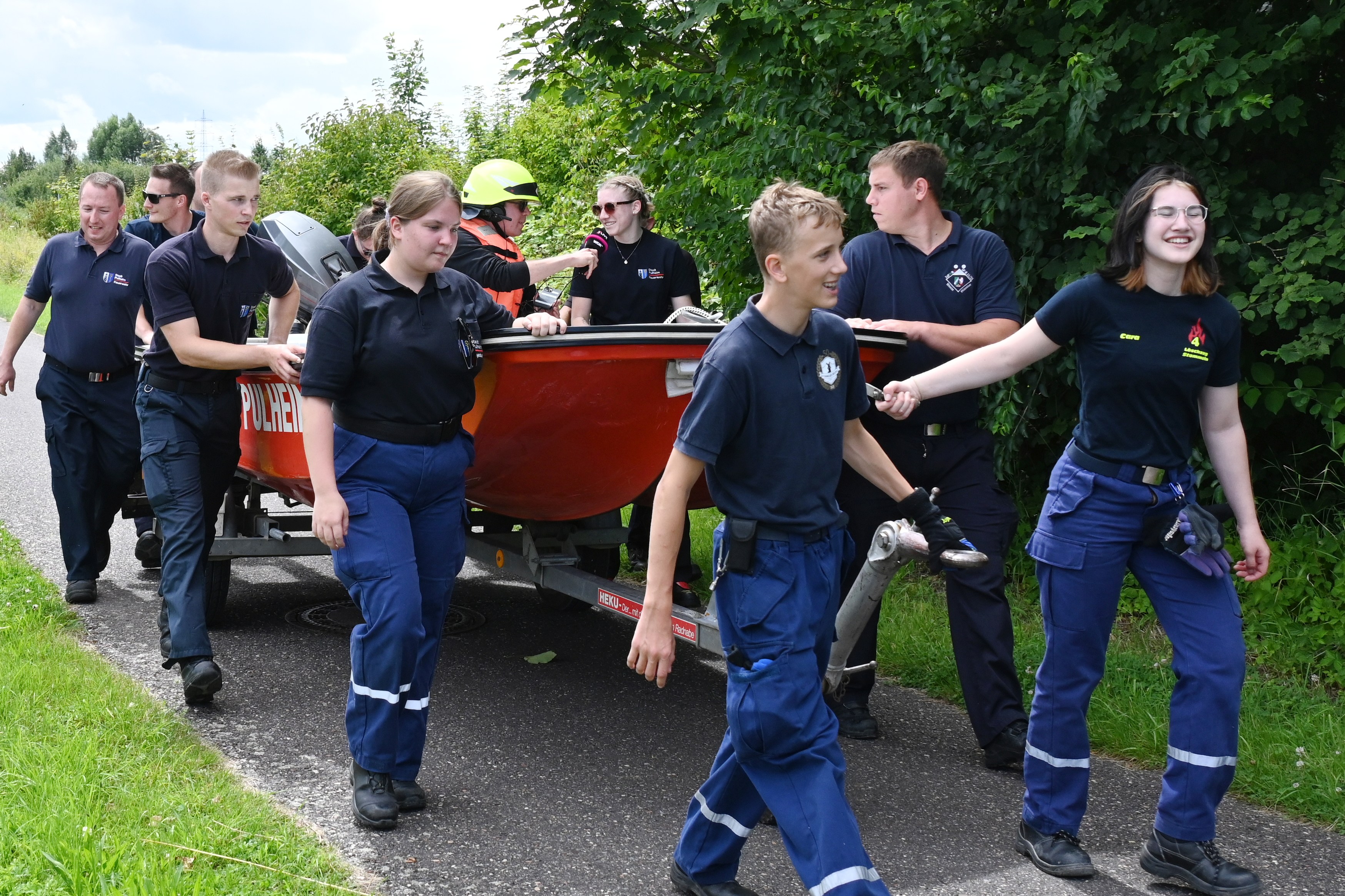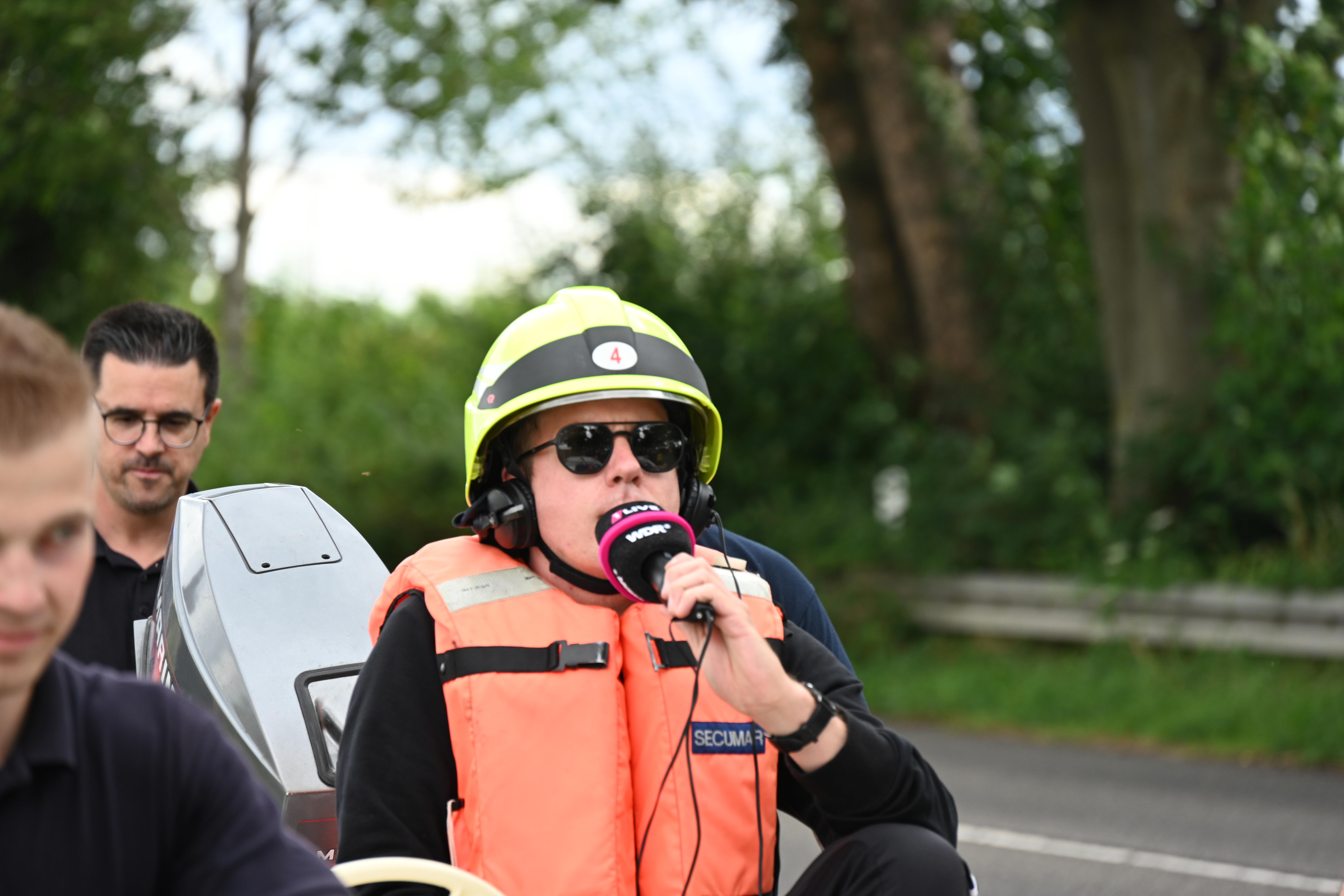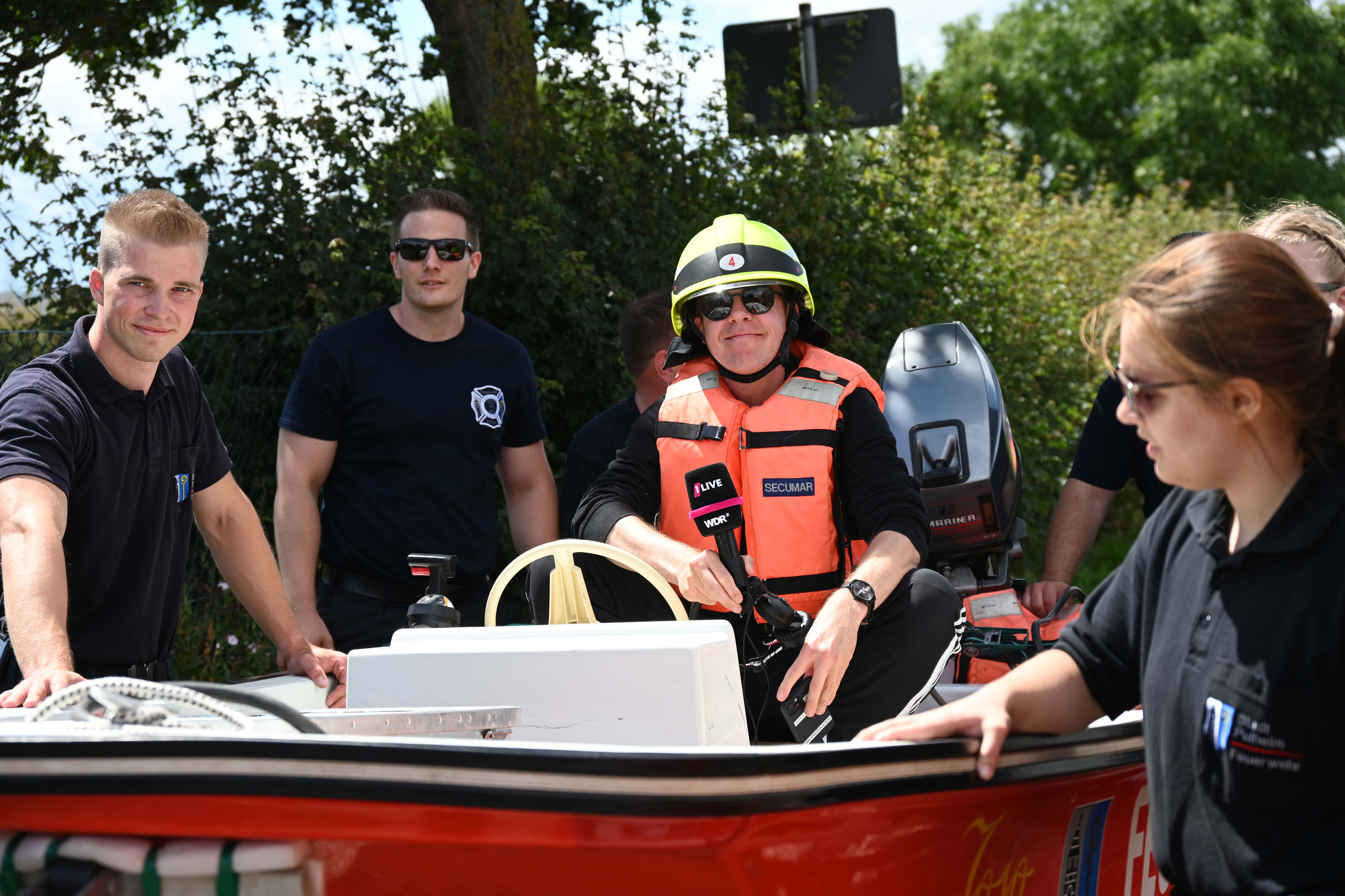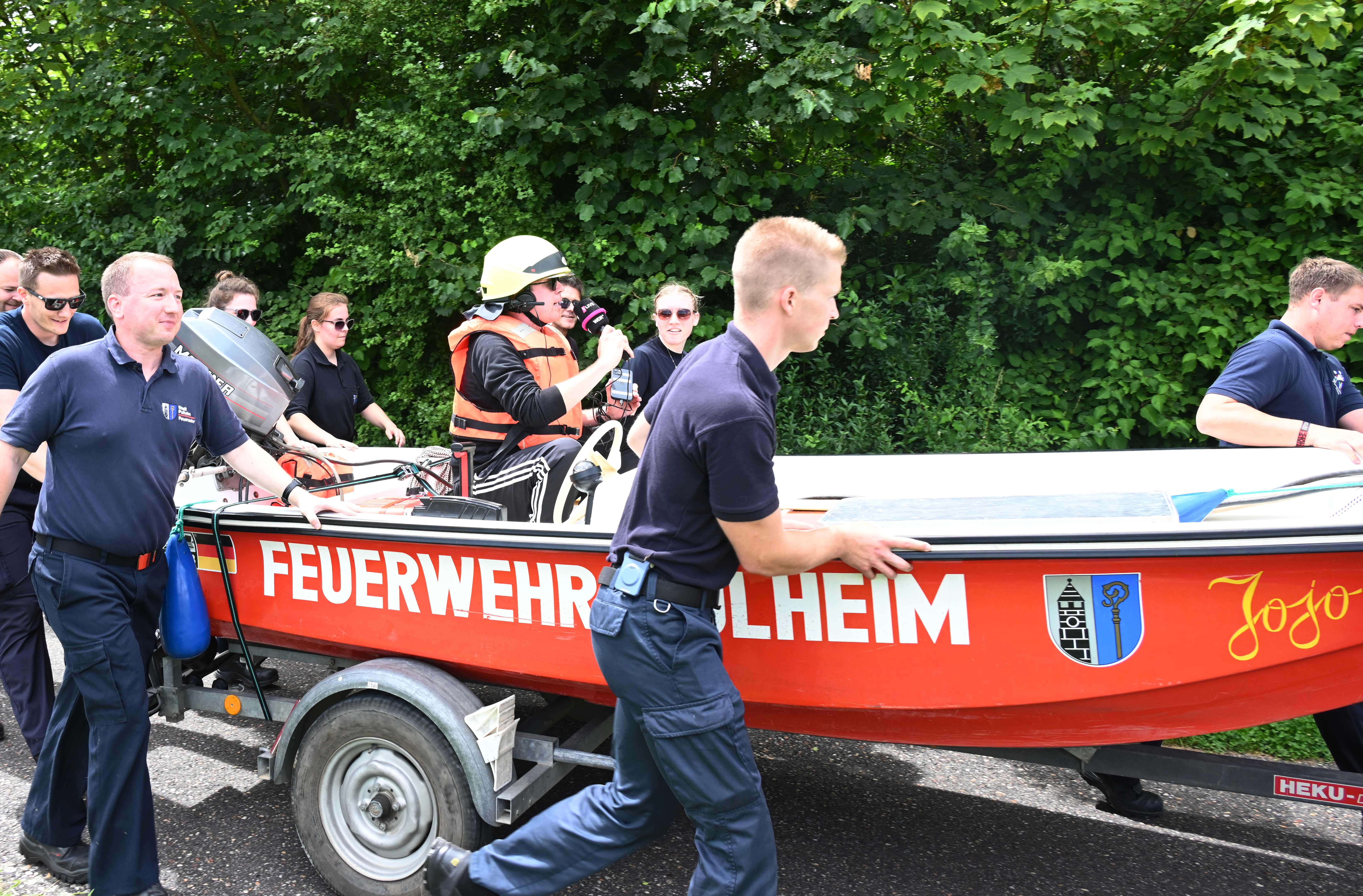 Ursprünglich wurde Daniel Danger am Dienstagvormittag, 16.07., in Pulheim, am Paul-Decker-Platz von 20 Mitgliedern der Feuerwehr erwartet. Von hier aus sollte die etwa knapp fünf Kilometer lange Tour mit einem auf einem Bootstrailer aufliegenden Mehrzweckboot bis hinter den Ortsausgang Stommeln gehen. Auf seinem Weg nach Pulheim kam es aber zu Verzögerungen, so dass sich das Team der Feuerwehr entschloss, Daniel Danger bereits ab der Stadtgrenze zwischen Köln und Brauweiler auf seiner Reise nach Weeze zu unterstützen. Nachdem Danger, ohne den Boden zu berühren, das Boot der Feuerwehr geentert hatte, ihm eine Schwimmweste und ein Feuerwehrhelm angelegt worden ist und er am Steuerrad Platz genommen hatte, begann die Fahrt entlang des Randkanals Richtung Pulheim. Auf dem Weg hatte Daniel Danger stets Kontakt zu seinem Sender und moderierte aus dem Boot heraus mehrere Liveschaltungen. Schnell wurde durch die Feuerwehr noch eine Route entworfen, um den Pulheimer Ortskern möglichst nur über kleine Nebenstraßen zu passieren, um dann auf dem Fahrradweg der Venloer Strasse Richtung Stommeln zu gelangen. Am Marktplatz in Stommeln wurde die Etappe nach knapp 10 Kilometern und der beachtlichen Zeit von 95 Minuten beendet. Nach dieser Leistung bedankte sich Goos und Danger bei allen Kräften für die flotte Fahrt und man war froh, den Moderator wohlbehalten und ohne gekentert zu sein, dem nächsten 1Live Zuhörerteam übergeben zu können, die den Weg dann mit einem Bollerwagen Richtung Rommerskirchen fortsetzten.
